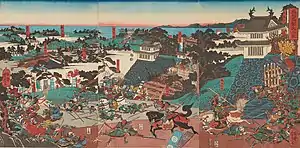 By September 23, they had taken over Taga Castle in Mutsu Province[4] and joined with his Tōkaidō forces. Yasuhira was forced to abandon his main military base at Kokubugahara Muchidate (present-day Tsutsuji-gaoka, Sendai).[4] The next day, the Hokurikudō forces defeated Tagawa Yukibumi and Akita Munebumi in Dewa Province. On September 25, Yoritomo's retainer Oyama Tomomasa defeated Northern Fujiwara forces in Monomigaoka and Yoritomo advanced to Takahaba Castle in Tamatsukuri. On October 1, Yoritomo was victorious and captured Takahaba Castle. His forces then headed for Hiraizumi.[5] This caused Yasuhira to abandon and flee his capital city Hiraizumi. He used a scorched-earth strategy and left Hiraizumi in flames on October 2.[4]