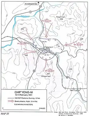 The Battle of Chipyong-ni (French: Bataille de Chipyong-ni), also known as the Battle of Dipingli (Chinese: 砥平里战斗; pinyin: Dǐ Pīng Lǐ Zhàn Dòu), was a decisive battle of the Korean War that took place from 13 to 15 February 1951 between US and French units of the US 23rd Infantry Regiment and various units of the Chinese People's Volunteer Army (PVA) around the village of Chipyong-ni. The result was a United Nations Command victory. The battle, along with the Third Battle of Wonju, has been called "the Gettysburg of the Korean War".[6][7][8]