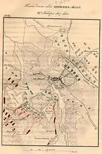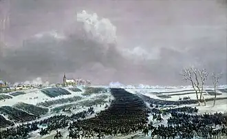 As Bennigsen hurriedly assembled his army at Jonkowo, elements of Marshal Nicolas Soult's IV Corps reached a position on his left rear on 3 February.[16] That day, General of Division Jean François Leval clashed with Lieutenant-General Nikolay Kamensky's 14th Division at Bergfried (Berkweda) on the Alle (Łyna) River, which flows roughly northward in the area. The French reported 306 casualties but claimed to have inflicted 1,100 on their adversaries.[17] After seizing Allenstein (Olsztyn), Soult moved north on the east bank of the Alle. Meanwhile, Napoleon threatened Bennigsen from the south with Marshal Pierre Augereau's VII Corps and Ney's forces. Kamensky held the west bank with four Russian battalions and three Prussian artillery batteries.[16] After an initial attack on Bergfried had been driven back, the French captured the village and bridge. A Russian counterattack briefly recaptured the bridge. That night, the French remained in possession of the field, and Soult claimed that he had found 800 Russian dead there.[18] Marching at night, Bennigsen retreated directly north to Wolfsdorf (Wilczowo) on the 4th. The next day, he fell back to the northeast, reaching Burgerswalde on the road to Landsberg (Górowo Iławeckie).[19]