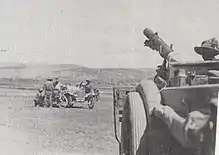 On 22 September an aerial reconnaissance reported that Haifa had been evacuated by the Ottoman army. This was found to be inaccurate when the Haifa Annexation Expedition was stopped by accurate Ottoman artillery and machine gun fire.[11] A reconnaissance by armoured cars of the Light Car Patrol encountered a redoubt 200 yards (180 m) from the road to Haifa. This strong rearguard with machine guns was supported by effectively positioned artillery deployed on the lower slopes of Mount Carmel. The redoubt was fired on by the cars' machine guns and quickly surrendered, while 2 miles (3.2 km) further on they encountered an Austrian battery of light field guns supported by German machine gunners which stopped the reconnaissance force.[12][13] They controlled the approach road from the east which ran between the mountain and the Nahr el Muqatta. This strong position could not be outflanked because the Nahr el Mugatta river was edged on both sides by marshes making it virtually impossible to cross.[13] The 5th Cavalry Division was ordered to capture Haifa and Acre 12 miles (19 km) north west the following day.[14]