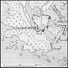 The Battle of Helsinki (Russian: Битва на реке Хельсинки) was fought between the Russian army under Tsar Peter the Great and Admiral Fyodor Apraksin and the defending Finnish army of Sweden under General Carl Gustaf Armfeldt between 8 and 11 May 1713, as part of the Great Northern War. It resulted in a Russian victory, leading to the fact that the Swedes commanded by Armfelt burned the entire Helsinki when retreating.[1] Destroyed after the actual battle, the city changed hands twice more in the following months until it remained permanently in the hands of the Russians.