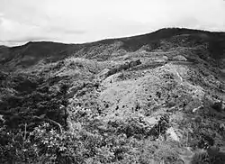 In response, the Australian commander sought to reduce the perimeter, with the 2/27th being ordered to move one company back up Mission Ridge, while the 2/14th moved to reinforce the 2/16th's positions and re-orientate to the south. Co-ordination proved difficult with only intermittent wireless contact, and in the confusion the entire 2/27th fell back, effectively giving up the ridge to the Japanese.[21] Meanwhile, under the command of Lieutenant Colonel Albert Caro, about 300 men from the 2/14th and 2/16th Infantry Battalions attacked the II/144th from the north amidst heavy rain, with the 2/14th striking the western side while the 2/16th concentrated on the eastern side, where the Japanese had dug-in several machine guns.[22] Several Japanese platoons were overrun in the assault and casualties were heavy among the Japanese defenders, but the attack proved unsuccessful as Japanese reinforcements arrived on the crest of Brigade Hill just in time,[23] and only a small number of Australians were able to break through to Maroubra Force Headquarters.[24] Later, an attempt was made to break through from the south by the company defending the headquarters, but this also proved unsuccessful with heavy casualties.[25] Despite reinforcement by a composite company of 95 to 110 men,[6][26] the Australians were unable to restore the situation and Potts was forced to order a withdrawal south towards Ioribaiwa. A small rearguard from the 2/27th launched a sharp counterattack, which succeeded in allowing the Australians to make a clean break.[27] The headquarters troops moved back down the track, while the isolated troops from the 2/14th, 2/16th and 2/27th Infantry Battalions were forced to break track and withdraw east across Brigade Hill to escape through the mountains towards Jawarere,[28] unbeknownst to the Japanese who held their positions.[6][16]