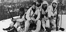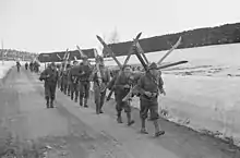 About 2,600 survivors were organised into an improvised marine infantry unit, the Gebirgsmarine and fought with the 139. Gebirgsjägerregiment in the subsequent land battle.[42] Although unsuited for combat in the mountainous terrain around Narvik, the shipwrecked sailors manned the two 10.5 cm (4.1 in) FlaK guns and the 11 light anti-aircraft guns salvaged from the ships sunk during the naval battles and conducted defensive operations.[5] The sailors were armed from the stocks captured at the Norwegian army base Elvegårdsmoen, more than 8,000 Krag-Jørgensen rifles and 315 machine guns intended for the mobilisation of Norwegian army units in the Narvik area.[43]