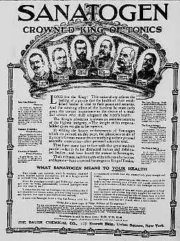 Sanatogen, "crowned King of Tonics," according to this 1911 advertisement, was "a concentrated scientific food that constructively gives strength and vitality"