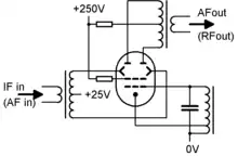 They can be used as two-quadrant, single-balanced mixers or (de)modulators with very linear qualities. Their mode of operation is similar to one-half of a Gilbert cell by applying an unbalanced signal f1 to the control grid and a balanced signal f2 to the deflection electrodes, then extracting the balanced mixing products f1f2 and f1 + f2 from the two anodes.[1][2] Similar to a pentagrid converter, the cathode and the first two grids can be made into an oscillator. Two beam deflection tubes can be combined to form a double-balanced mixer.