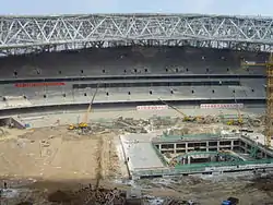 In an attempt to hide steel supports for the retractable roof, required in the bidding process, the team developed the "random-looking additional steel" to blend the supports into the rest of the stadium.[10] Twenty-four trussed columns encase the inner bowl,[13] each one weighing 1,000 tons.[8] Despite the random appearance of the Stadium, each half is nearly symmetrical.[14] After a collapse of a roof at the Charles de Gaulle Airport,[8] Beijing reviewed all major projects. It was decided to eliminate the retractable roof, the original inspiration for the "nest" design,[8] as well as 9,000 seats from the design.[14] The removal of the elements helped to bring the project under the reduced construction budget of $290 million, from an original $500 million.[8] With the removal of the retractable roof, the building was lightened, which helped it stand up to seismic activity; however, the upper section of the roof was altered to protect fans from weather.[14] Enerpac was granted the contract to perform the stage lifting and lowering of the stadium roof as part of the construction process.[15] China National Electric Engineering Co Ltd and China National Mechanical Engineering Corporation lifted and welded the steel structure. Due to the stadium's outward appearance, it was nicknamed "The Bird's Nest". The phrase was first used by Herzog & de Meuron, though the pair still believes "there should be many ways of perceiving a building."[10] The use is a compliment Li explained, "In China, a bird's nest is very expensive, something you eat on special occasions."[8]