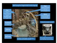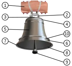 ![]() Parts of a typical tower bell hung for swinging: 1. Bell yoke or headstock, 2. canons, 3. crown, 4. shoulder, 5. waist, 6. sound bow, 7. lip, 8. mouth, 9. clapper, 10. bead line | |