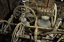 Bells hung for full circle ringing are swung through just over a complete circle from mouth uppermost. A stay (the wooden pole seen sticking up when the bells are down) engages a mechanism to allow the bell to rest just past its balance point. The rope is attached to one side of a wheel so that a different amount of rope is wound on and off as it swings to and fro. The bells are controlled by ringers (one to a bell) in a chamber below, who rotate the bell to through a full circle and back, and control the speed of oscillation when the bell is mouth upwards at the balance-point when little effort is required.