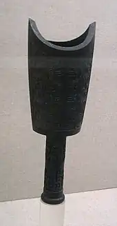 The earliest archaeological evidence of bells dates from the 3rd millennium BC, and is traced to the Yangshao culture of Neolithic China.[6] Clapper-bells made of pottery have been found in several archaeological sites.[7] The pottery bells later developed into metal bells. In West Asia, the first bells appear in 1000 BC.[6] The earliest metal bells, with one found in the Taosi site and four in the Erlitou site, are dated to about 2000 BC.[8] With the emergence of other kinds of bells during the Shang Dynasty (c. 1600 – c. 1050 BC), they were relegated to subservient functions; at Shang and Zhou sites, they are also found as part of the horse-and-chariot gear and as collar-bells of dogs.[9] By the 13th century BC, bells weighing over 150 kg were being cast in China. After 1000 AD, iron became the most commonly used metal for bells instead of bronze. The earliest dated iron bell was manufactured in 1079, found in Hubei Province.[10]