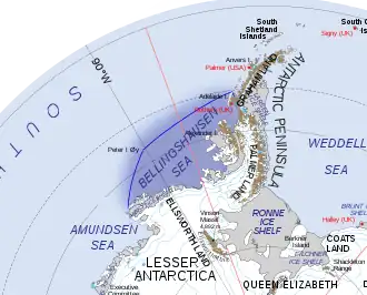 The Bellingshausen Sea is an area along the west side of the Antarctic Peninsula between 57°18'W and 102°20'W, west of Alexander Island, east of Cape Flying Fish on Thurston Island, and south of Peter I Island (there the southern Vostokkysten).[1] The Bellingshausen Sea borders the Eights Coast, the Bryan Coast, and the west part of the English Coast. To the west of Cape Flying Fish it joins the Amundsen Sea.