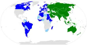 Countries join the Belt and Road Initiative by signing a memorandum of understanding with China regarding their participation in it. The Government of China maintains a listing of all involved countries on its Belt and Road Portal,[60] and state media outlet Xinhua News Agency puts out a press release whenever a memorandum of understanding related to the Belt and Road Initiative is signed with a new country.[61] Not counting China, there were 154 countries formally affiliated with the Belt and Road Initiative As of August 2023 according to observers at Fudan University's Green Finance and Development Center,[62] and an independent analysis from Germany from the same time also found 148 member states out of 249 political entities surveyed.[63] The Council on Foreign Relations additionally found 139 member countries as of March 2021;[64] countries that are documented as joining since then include Syria[65] and Argentina.[66] The full list of members according to the Chinese government[60] is below: