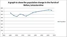 The earliest record of population in Belton was in 1801, when there was a total of 586 residents in the area. This increased steadily for 50 years to 751. However, a gap in the dataset from 1851 to 1881 shows there was a significant drop between here to 645. From 1881 there was a steady decline until 1911, where after that there has been a steady increase to a current population of 734.[9] This could be down to the boundary changes that happened between 1931 and 1934 which changed the acreage and population of Belton.[10] The 2011 census recorded that 49% of the village was male and 51% female which suggests the gender distribution is rather well balanced.[11]