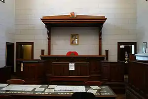 The historical roots of the term come from judges formerly having sat on long seats or benches (freestanding or against a wall) when presiding over a court.[2] The bench is usually an elevated desk area that allows a judge to view, and to be seen by, the entire courtroom. The bench was a typical feature of the courts of the Order of St. John in Malta, such as at the Castellania, where judges and the nominated College of Advocates sat for court cases and review laws.[4]