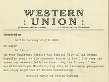 A letter from Mayor Arthur Scholtz of Berlin, Germany, honoring the "Paper City" on its 100th anniversary on July 5, 1929