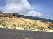 Graffiti on a road on the border between Dâmbovița County and Prahova County, in Romania, saying Uniți sub tricolor – Basarabia e România! ("United under the tricolor – Bessarabia is Romania!").