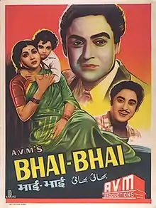 Bhai-Bhai (transl.Brothers) is a 1956 Indian Hindi-language drama film directed by M. V. Raman for A. V. M. Productions.[1][2] It had screenplay by Javar Seetharaman, with Hindi screen adaptation of the Tamil film Ratha Paasam directed by C.V. Sridhar. The music director was Madan Mohan,[3] with dialogues and lyrics written by Rajendra Krishan. One of the popular songs from the film was "Ae Dil Mujhe Bata De", sung by Geeta Dutt, "in an unabrasive fast tempo".[4] The song became one of Madan Mohan's earliest hits, and the music of the film in journalist-author Bharatan's words, went on to "conquer the box office".[1][5]