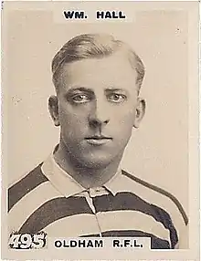 William Hall (27 January 1889 – fourth ¼ 1964) was an English rugby union and professional rugby league footballer who played in the 1910s and 1920s. He played club level rugby union (RU) for Gloucester RFC, and representative level rugby league (RL) for Great Britain and England, and at club level for Oldham (Heritage No. 152), as a centre, or stand-off, i.e. number 3 or 4, or 6.[1]