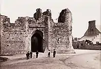 The surviving gatehouse resembles the architecture of Caerphilly Castle, which may indicate that the same master mason worked on both fortifications.[5] This would date the Palace to the time of William de Braose who became Bishop of Llandaff in 1266.[5][6] It is believed the Palace was attacked and damaged by Owain Glyndŵr in the rebellion of 1402–05, and was subsequently abandoned by the bishop of the period,[5] who moved to live at Mathern Palace in Monmouthshire; bishops did not return to live near their cathedral again until 1850. The Bishops Palace was intact in 1610 when it was shown in a plan by John Speed, but was probably destroyed during the English Civil War.[7]