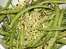 The black-eyed pea or black-eyed bean[2] is a legume grown around the world for its medium-sized, edible bean. It is a subspecies of the cowpea, an Old World plant domesticated in Africa, and is sometimes simply called a cowpea.