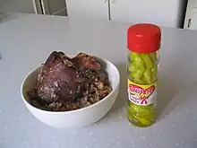 In the Southern United States, eating black-eyed peas or Hoppin' John (a traditional soul food) on New Year's Day is thought to bring prosperity in the new year.[14] The peas are typically cooked with a pork product for flavoring (such as bacon, fatback, ham bones, or hog jowls) and diced onion, and served with a hot chili sauce or a pepper-flavored vinegar. The traditional meal also includes cabbage, collard, turnip, or mustard greens, and ham. The peas, since they swell when cooked, symbolize prosperity; the greens symbolize money; the pork, because pigs root forward when foraging, represents positive motion.[15] Cornbread, which represents gold, also often accompanies this meal.[16]