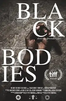 Black Bodies is a 2020 Canadian short film, directed by Kelly Fyffe-Marshall, and produced by Tamar Bird and Sasha Leigh Henry.[1] Inspired by a real-life incident when Fyffe-Marshall, Komi Olaf and Donisha Prendergast were travelling in California, and a woman in the neighbourhood called the police on them because she wrongly believed they were burglarizing their Airbnb rental, the film features Olaf and Prendergast performing spoken word pieces about the trauma of being victimized by anti-Black racism.[2]
