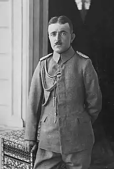 In the months before the outbreak of World War I, officials of the Ottoman Empire vainly tried to secure an alliance with a great power.[10] The Germanophile Ottoman War Minister Enver Pasha directly proposed an alliance on 22 July 1914 to the German ambassador in Istanbul, Hans Freiherr von Wangenheim, but he was rebuffed. Kaiser Wilhelm II overruled Wangenheim two days later, and an Ottoman draft for an alliance was delivered in Berlin on 28 July—the day World War I began. The July Crisis had climaxed and it appeared Germany would be fighting a two-front war with France and Russia. With the Germans hesitant to make any more significant military obligations, Wangenheim was authorised by German Chancellor Theobald von Bethmann Hollweg to sign the agreement only if the Ottoman Empire would "undertake action against Russia worthy of its name."[11] On 1 August, Enver offered Wangenheim the new battleship Sultân Osmân-ı Evvel in exchange for German protection. This was likely a clever ploy; United Kingdom officials, in order to bolster the Royal Navy to wage war against Germany, had already seized Sultan Osman-ı Evvel and the battleship Reşadiye, which were under construction in their shipyards. Wagenheim and the majority of the Ottoman government were unaware of this. Enver probably already knew of the seizure, since actually releasing the battleship to a foreign nation would have caused an uproar from the public and the government. Ambassador Wagenheim signed the treaty the next day, creating the secret Ottoman–German alliance.[12]