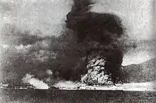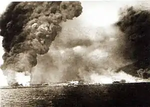 Shortly before 10:50, Berk-i Satvet sent a shore party to warn the defenceless population of Novorossiysk, before opening up with her guns. She was soon thereafter joined by Midilli, which had been busy laying mines in the Kerch Strait.[6] Midilli fired a total of 308 shells, sinking several Russian grain cargo ships and destroying about 50 oil tanks.[5] On their way back to Ottoman territory, Midilli's crew attempted to cut Sebastopol's undersea telegraph cable with Varna, Bulgaria, but failed.[21]