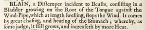 According to Ephraim Chambers' 18th-century Cyclopaedia, or an Universal Dictionary of Arts and Sciences, blain was "a distemper" (in the archaic eighteenth-century sense of the word, meaning "disease") occurring in animals, consisting of a "Bladder growing on the Root of the Tongue against the Wind-Pipe", which "at length swelling, stops the Wind". It was thought to occur "by great chafing, and heating of the Stomach".