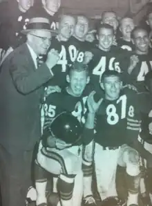 George Halas, Bob Carey #85 (front row, center), Harlon Hill #87 and Chicago Bear teammates celebrate their 28–6 Wrigley Field win over the 49ers in 1958.