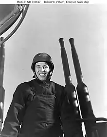 The United States entered World War II with the attack on Pearl Harbor on December 7, 1941. Feller heard about the bombing while returning from a visit to his terminally ill father at Des Moines to Chicago where he was to sign a new Indians contract.[6] Two days later, he volunteered for the United States Navy, becoming the first American professional athlete to enlist.[31] Originally he tried to enlist as a fighter pilot but failed hearing tests. Feller attended basic training at Norfolk Naval Base and served as a physical fitness instructor there. He also pitched in baseball games hosted by the military. Although he had received a military exemption owing to his father's failing health, he wanted to serve in combat missions.[32] Feller said, "I told them I wanted to ... get into combat; wanted to do something besides standing around handing out balls and bats and making ball fields out of coral reefs."[33] Feller was assigned to USS Alabama;[34] he had hoped to serve on USS Iowa, but it would not be commissioned for another six months after Alabama, joining the fleet February 22, 1943.[2]: 119