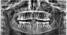Dental examination is a method of body identification that involves the comparison of antemortem and postmortem dental records, such as radiographs and photographs.[18] The jaw is analysed to detect any peculiarities in the teeth or any diseases.[18] In the scenario where skin prints are unable to assist in the process of identification, dental examination can be used.[19] The Forensic Dentistry and Anthropology Center of the Dental Faculty of Piracicaba analysed radiographs and dental records of a "surgically implanted orthopedic plate"[19] to successfully identify a burned body. The success of dental identification can be tainted if the individual has endured a physically traumatic experience that has caused damage to their teeth and jaw.[20] In this scenario, DNA identification is used in the process of body identification.