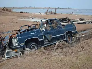 Hurricane Ike caused cataclysmic destruction of the peninsula, reducing the region to rubble and causing severe, permanent change in the shoreline. Entire communities along the upper Texas coast were simply wiped out by Ike's catastrophic storm surge.[26] Ike's effects were disproportionally felt near the long, low-lying Bolivar Peninsula which has typical elevations around 2 m. Despite being only a strong category 2 storm with maximum winds at landfall of 95 knots (49 m/s, Berg, 2009), Ike's extremely large, long-lasting surge and waves devastated the peninsula.[25] In Gilchrist, Texas, NOAA aerial photography reveals complete destruction. The Rollover Pass bridge was reduced to one lane. Of the 1,000 buildings in Gilchrist, 99.5% of them were knocked off of their foundations. Of the buildings off of the foundations, the storm demolished some and washed others onto swamplands behind Gilchrist.[27]