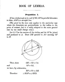 The Book of Lemmas was first introduced in Arabic by Thābit ibn Qurra; he attributed the work to Archimedes. A translation from Arabic into Latin by John Greaves and revised by Samuel Foster (c. 1650) was published in 1659 as Lemmata Archimedis. Another Latin translation by Abraham Ecchellensis and edited by Giovanni A. Borelli was published in 1661 under the name Liber Assumptorum.[2] T. L. Heath translated Heiburg's Latin work into English in his The Works of Archimedes.[3][4] A more recently discovered manuscript copy of Thābit ibn Qurra's Arabic translation was translated into English by Emre Coşkun in 2018.[5]