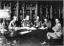 Savinkov (center) alongside Alexander Kerensky (second from right) and the rest of the Russian war ministry. August 1917