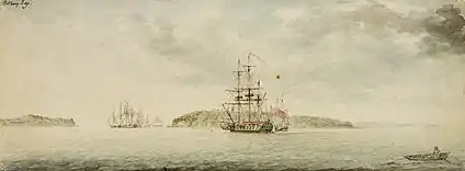 Lieutenant James Cook first landed at Kurnell, on the southern banks of Botany Bay, in what is now Silver Beach, on Sunday 29 April 1770, when navigating his way up the east coast of Australia on his ship, HMS Endeavour. Cook's landing marked the beginning of Britain's interest in Australia and in the eventual colonisation of this new "southern continent".[7] Initially the name Stingrays Harbour was used by Cook and other journal keepers on his expedition, for the stingrays they caught.[8] That name was also recorded on an Admiralty chart.[9] Cook's log for 6 May 1770 records "The great quantity of these sort of fish found in this place occasioned my giving it the name of Stingrays Harbour". However, in the journal prepared later from his log, Cook wrote instead: (sic) "The great quantity of plants Mr. Banks and Dr. Solander found in this place occasioned my giving it the name of Botanist Botany Bay".[note 1][9]