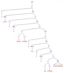 ![]() "John thinks he is a nice fellow", adapted from Higginbotham, 1980: 682 (16), drawn using phpSyntaxTree |
