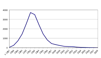 The first confirmed instance in which an animal fell ill with the disease occurred in 1986 in the United Kingdom, and lab tests the following year indicated the presence of BSE; by November 1987, the British Ministry of Agriculture accepted it had a new disease on its hands.[66] Subsequently, 177 people (as of June 2014) contracted and died of a disease with similar neurological symptoms subsequently called (new) variant Creutzfeldt–Jakob disease (vCJD).[67][68] This is a separate disease from 'classical' Creutzfeldt–Jakob disease, which is not related to BSE and has been known about since the early 1900s. Three cases of vCJD occurred in people who had lived in or visited the UK – one each in the Republic of Ireland, Canada, and the US. Also, some concern existed about those who work with (and therefore inhale) cattle meat and bone meal, such as horticulturists, who use it as fertilizer. Up-to-date statistics on all types of CJD are published by the National Creutzfeldt–Jakob Disease Surveillance Unit in Edinburgh, Scotland.
