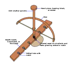 A bow drill is a simple hand-operated type of tool, consisting of a rod (the spindle or drill shaft) that is set in rapid rotary motion by means of a cord wrapped around it, kept taut by a bow which is pushed back and forth with one hand. This tool of prehistoric origin has been used both as a drill, to make holes on solid materials such as wood, stone, bone, or teeth, and as a fire drill to start a fire.[1][2][3]