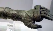 Ancient Middle-Eastern and Egyptian depictions of boxing c. 2000 BC showed contests where fighters had a band supporting the wrist. Early depictions of gloves in boxing date back to Minoan Crete c. 1500 BC.[1][2] The use of hand protection in fighting contests undertaken for sport has been known since Ancient Greece. However, the gloves were very different from those of modern boxing, as was the sport itself.[3] In Ancient Greece, it was common practice to tie strips of leather round the hands for protection. In Roman times, this developed into the gladiatorial cestus, with metal added to the gloves to inflict greater damage.[4] The oldest surviving example of boxing gloves date to around AD 120, coming in the form of two non-matching leather bands that were recovered from excavations at the Roman fort of Vindolanda.[5] The brutality of the sport caused the boxing to be banned in AD 393.[6]