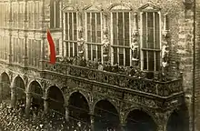 Early on 15 November, Henke appeared with delegates on the balcony of the Rathaus and declared the Council "the representative of the entire people". A red flag was hoisted. His declaration made no promise of sudden or radical change. Citizens were assured that private property would be protected and plunderers summarily dealt with. Now that "democracy had been victorious", it called on members of the old government to cooperate with the new powers.[5] Appearing to respect the council as legislative successor to the Bürgerschaft, the Senat continued to direct the administrative bureaucracy more or less as before.[6]