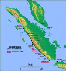 British Bencoolen was a possession of the British East India Company (EIC) extending nearly 500 miles (800 km) along the southwestern coast of Sumatra and centered on the area of what is now Bengkulu City. The EIC established a presence there in 1685,[1] and in 1714 the EIC built Fort Marlborough there. A local datoo allowed EIC to build the fort in order to protect the settlement from the Dutch.