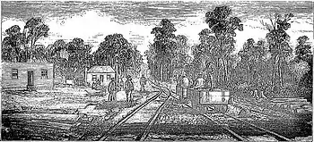 Wooden-railed, horse-drawn tramway (Tasmanian Charcoal Iron Company) Unknown artist / engraver. The view is looking toward the mine. Published in Illustrated Australian News for Home Readers Tue 9 Sep 1873,  Page 156.[8]