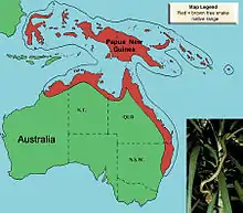 The brown tree snake is native to coastal Australia, Papua New Guinea, and many islands in northwestern Melanesia. The species occurs on variably sized islands, extending from Sulawesi in eastern Indonesia through Papua New Guinea and the Solomon Islands and into the wettest coastal areas of Northern Australia.[6] The snakes on Guam represent the only documented reproductive population outside the native range. Since January 2016, however, four snakes have been sighted on the island of Saipan in the Northern Mariana Islands.[7]