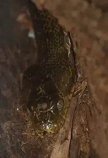 The brown tree snake is a nocturnal and arboreal species that uses both visual and chemical cues when hunting, either in the rainforest canopy or on the ground.[3] It is a member of the subfamily Colubrinae, genus Boiga, which is a group of roughly twenty-five species that are referred to as "cat-eyed" snakes for their vertical pupils.[4] The brown tree snake is generally 1–2 m (3–6 ft) in length in its native range. The snake is long and slender, which facilitates its climbing ability and allows it to pass through tiny spaces in buildings, logs, and other shaded locations, where it seeks refuge during daylight. Variations in coloration occur in the snake's native range, ranging from a lightly patterned brown to yellowish/green or even beige with red, saddle-shaped blotches. They are rear-fanged, have a large head in relation to their body, and can survive for extended periods of time without food.[4] The median age of maturity for these snakes is estimated to be 3.1 years in males and 3.7 years in females.[5]