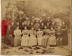 Tsarevna Miladinova, the founder of the first Bulgarian girls' school in Thessaloniki, with teachers and students in the 1882–1883 school year. She is in the middle of the middle row.