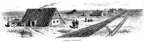 This type of shelter was created by many of the earliest Ukrainian Canadian settlers as their first home in Canada at the end of the 19th century. The first step was to peel back and save the sod, then excavate the earth to a depth of approximately a metre. A poplar roof frame was then created, over which the saved sod would be laid. Then a window, a door, a wood stove, and a bed platform would be installed. A typical burdei measured no more than two by four metres. The burdei was a temporary refuge until a "proper" home of poplar logs and mud/straw plaster could be built.[7]