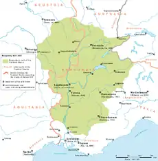 The Burgundians are first mentioned together with the Alamanni as early as the 11th panegyric to emperor Maximian given in Trier in 291 AD, referring to events that must have happened between 248 and 291, and they apparently remained neighbours for centuries.[1] By 411 a Burgundian group had established themselves on the Rhine, between Franks and Alamanni, holding the cities of Worms, Speyer, and Strasbourg. In 436 AD, Aëtius defeated the Burgundians on the Rhine with the help of Hunnish forces, and then in 443, he re-settled the Burgundians within the empire, in eastern Gaul.