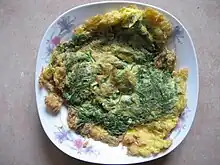 Traditionally, the Burmese eat meals from plates on a low table or daunglan, while sitting on a bamboo mat.[14] Dishes are simultaneously served and shared.[14] A traditional meal includes steamed white rice as the main dish accompanied by Burmese curries, a light soup or consommé, and other side dishes, including fried vegetables, Burmese fritters, and ngapi yay gyo (ငါးပိရည်ကျို), a plate of fresh and blanched vegetables served with pickled fish dip.[12] The meal is then finished with a piece of palm sugar or laphet (fermented tea leaves).[15]