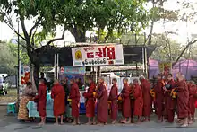 Buddhist monks in Mandalay receive food alms from a htamanè hawker during their daily alms round (ဆွမ်းလောင်းလှည့်).