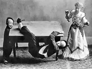 At the age of three, Keaton began performing with his parents in The Three Keatons. He first appeared on stage in 1899 in Wilmington, Delaware. The act was mainly a comedy sketch. Myra played the saxophone to one side, while Joe and Keaton performed center stage, both wearing slapshoes, bald-headed wigs and "Irish" beards. The young Keaton goaded his father by disobeying him, and the elder Keaton responded by throwing him against the scenery, into the orchestra pit, or even into the audience. A suitcase handle was sewn into Keaton's clothing to aid with the constant tossing. The act evolved as Keaton learned to take trick falls safely; he was rarely injured or bruised on stage. This knockabout style of comedy led to accusations of child abuse, and occasionally, arrest. However, Keaton was always able to show the authorities that he had no bruises or broken bones. He was eventually billed as "The Little Boy Who Can't Be Damaged", and the overall act as "The Roughest Act That Was Ever in the History of the Stage".[21] Decades later, Keaton said that he was never hurt by his father and that the falls and physical comedy were a matter of proper technical execution. In 1914, he told the Detroit News: "The secret is in landing limp and breaking the fall with a foot or a hand. It's a knack. I started so young that landing right is second nature with me. Several times I'd have been killed if I hadn't been able to land like a cat. Imitators of our act don't last long, because they can't stand the treatment."[21]